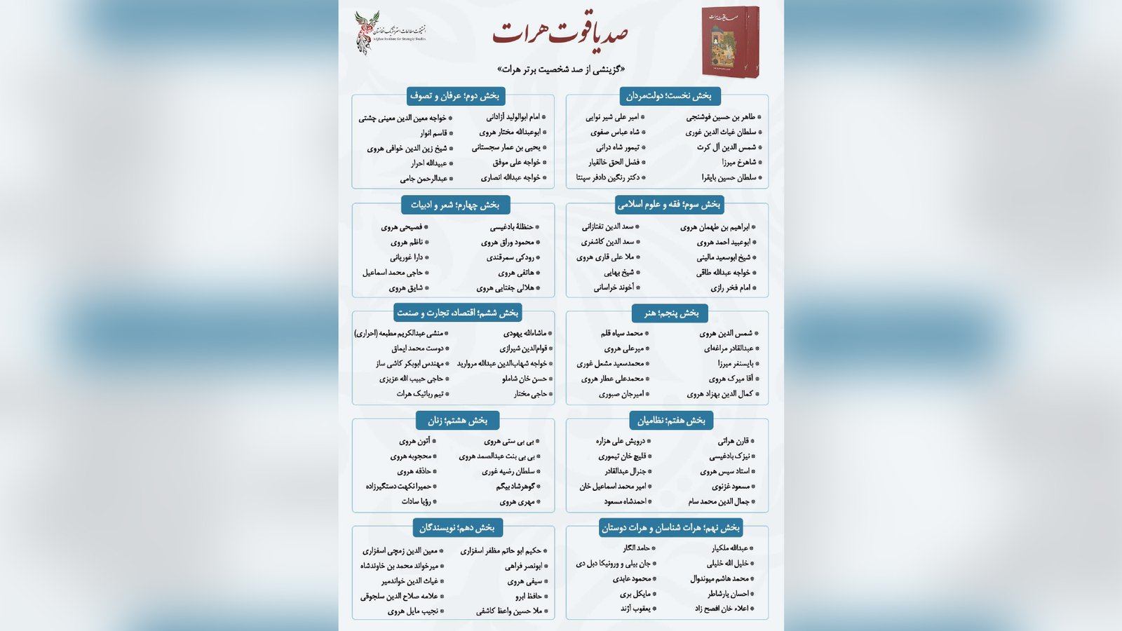 انستیتوت مطالعات استراتیژیک افغانستان، کتابی را با عنوان «صد یاقوت هرات»، منتشر کرده که در آن ۱۰۰ چهره برجسته فرهنگی، سیاسی، علمی و نظامی هرات معرفی شدهاند.