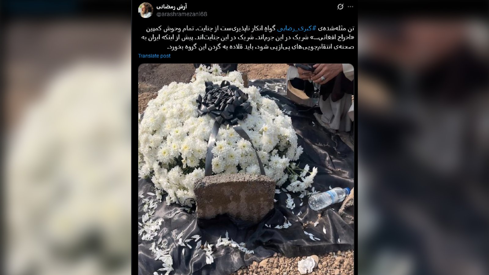 یک کاربر ایرانی به نام آرش رمضانی با هشتک زدن نام کبرا رضایی در شبکه اکس نوشته است:«تن مثله‌شده‌ی کبرا رضایی گواهِ انکار ناپذیری‌ست از جنایت. تمام وحوش کمپین اخراج افغانی…» شریک در این جرم‌اند. شریک در این جنایت‌اند. پیش از اینکه ایران به صحنه‌ی انتقام‌جویی‌های پی‌ازپی شود، باید قلاده‌ به گردن این گروه بخورد.»