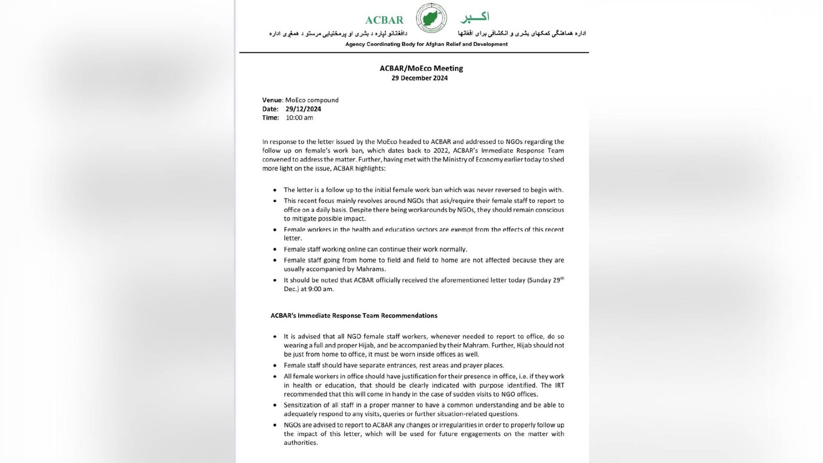 در نامه «اکبر» به نهادهای مربوطه آمده که این نهاد نامه‌ای در ارتباط به پیگری موضوع ممنوعیت کار زنان در نهادهای غیردولتی را از وزارت اقتصاد دریافت کرده و پس از دریافت این نامه گروه واکنش فوری نهاد جلسه برگزار کرده و توصیه‌هایی را به نهادهای زیربط ارایه کرده است.