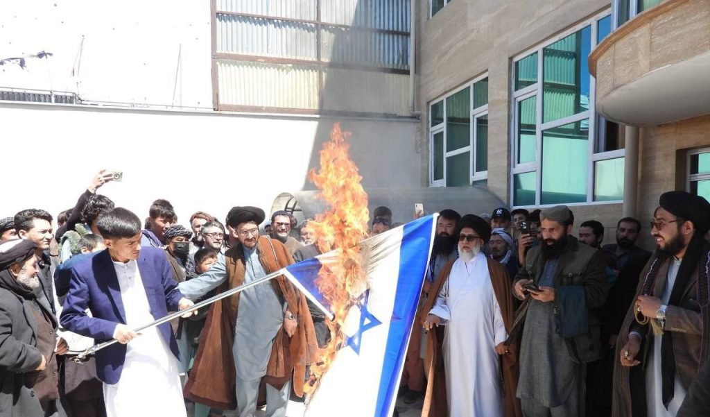 در تصاویری که از جریان برگزاری این مراسم در دفتر مرکز تبیان در کابل منتشر شده، عیسی حسینی مزاری، رییس این مرکز در کنار پرچم آتشزده اسرائیل ایستاده است.