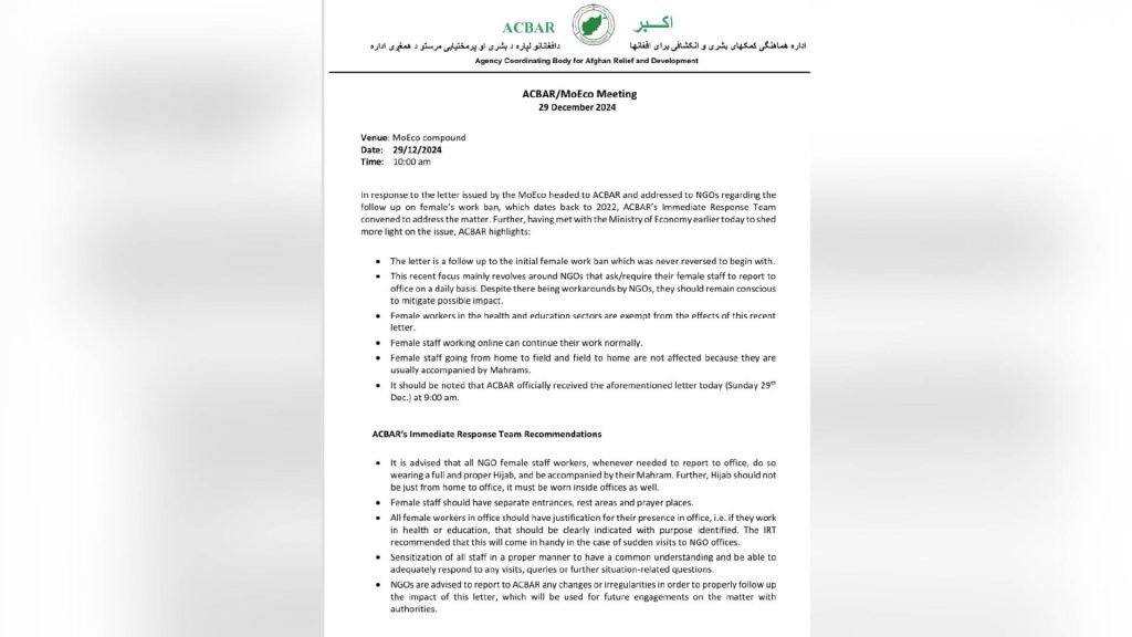 اداره همآهنگی کمکهای بشری و انکشافی برای افغانستان-اکبر، در نامهای به نهادهای زیرمجموعه این نهاد گفته که طبق دساتیر طالبان در مورد کار و حجاب زنان رفتار نمایند و به افراد این گروه اجازه دهند که از چگونگی حضور زنان و حجاب آنان در دفاتر نظارت داشته باشند.