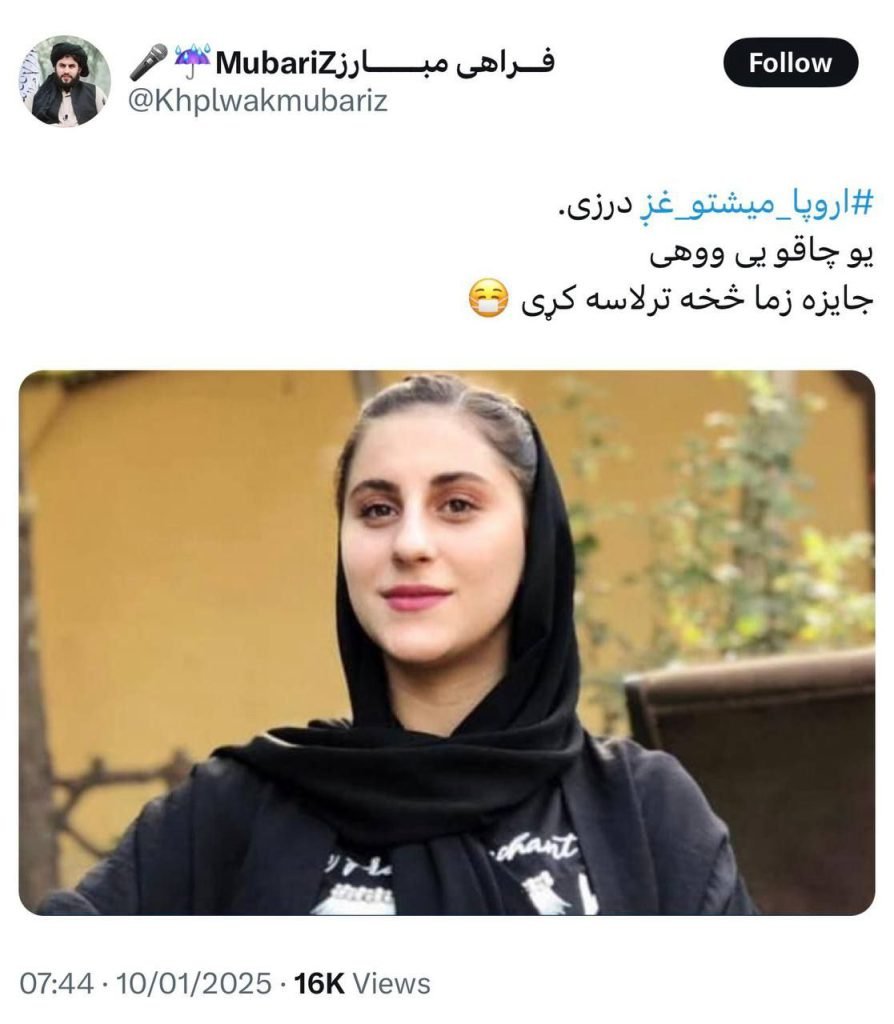یکی از اعضای طالبان به نام مبارز فراهی که احتمالا از ولایت فراه باشد، خطاب به طرفداران طالبان در اروپا به زبان پشتو نوشته است: «یو چاقویی ووهی، جایزه زما حخه ترلاس کری» یعنی او را یک چاقو بزنید و جایزه از ما بدست آورید.