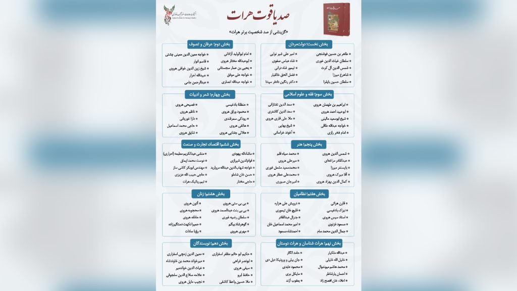 در میان شخصیتهایی که معرفی شدهاند، نام چهرههایی چون گوهرشاد بیگم، سلطان حسین بایقرا، امیرعلیشیر نوایی، احمدشاه مسعود، محمد اسماعیلخان، رنگین دادفر سپنتا، رویا سادات، اعضای تیم دختران رباتساز هرات و حمیرا نکهت دستگیرزاده نیز دیده میشود.