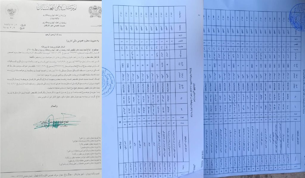 در این نامه که به امضای مولوی روحالله روحانی رییس اداره زراعت ولایت پروان صادر شده، آمده است که براساس هدایت وزارت زراعت و فرمان رهبر طالبان در مورد تنقیص تشکیلاتی، ۳۱ بست اداره زراعت پروان تنقیص شده است.
