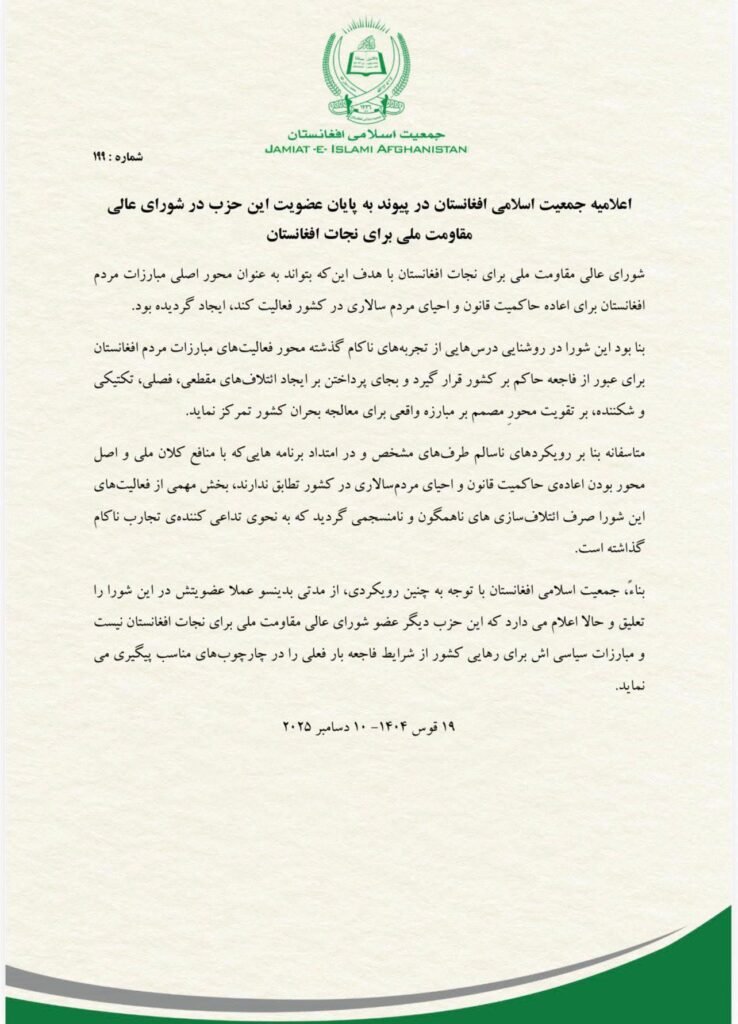 حزب جمعیت اسلامی افغانستان به رهبری صلاحالدین ربانی، در اعلامیهای، پایان عضویت این حزب در شورای عالی مقاومت برای نجات افغانستان را اعلام کرد.